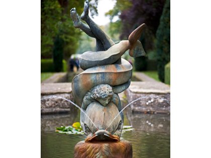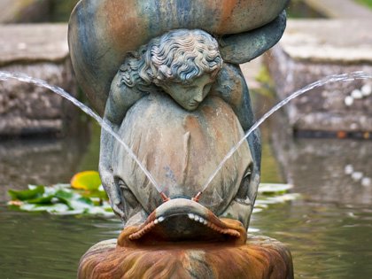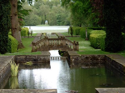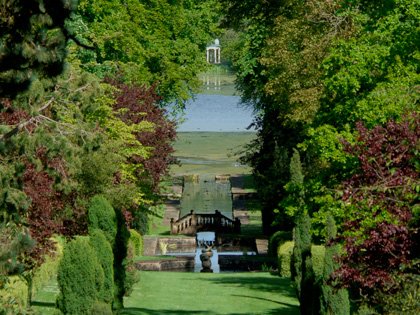 The stone-edged canal follows the bold linear axis of the earlier Victorian arboretum, carried for the greater part of its length through woodland. Variety is given to the design by a series of secretive enclosed lawns, surrounding rectangular and quatrefoil pools, and by effectively placed Italian marble seats and statuary. The canal stream is made to perform every possible manoeuvre before it reaches the lake, running over narrow rills and miniature cascades and beneath a hump-backed balustraded bridge. At one point the water is thrown into the air by the charmingly playful Dolphin and Putti bronze fountain. Water-lilies decorate the surface, and box hedges are flanked by stone figures on columns, and herms portraying Roman gods. Where it meets the lake, the vista continues eastwards to the domed and columned garden temple, also designed by Peto, which sits on the opposite shore.
